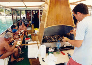 has a length of 14 meters, and capacity of 42 people. We organize daily trips with a picnic (lunch), which includes fish or grilled meat, side dish and salad. The lunch is prepared on board in front of our guests! The price of the trip also includes the